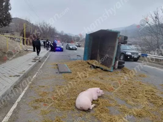 Իսկ բախման հետևանքով «ԶԻԼ»-ը, որը բարձված է եղել մոտ 30 խոճկորով, կողաշրջվել է՝ հայտնվելով ճանապարհի մեջտեղում՝ երթևեկելի գոտում։