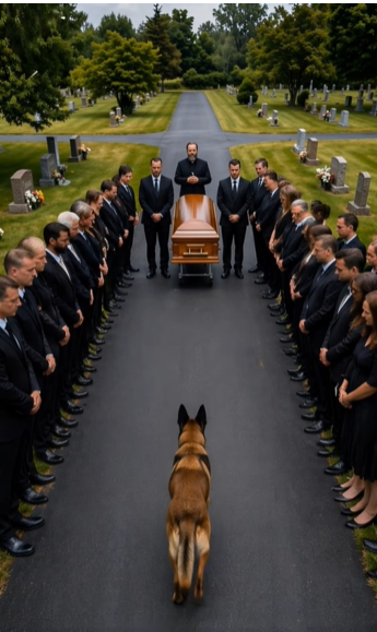 Un poco más apartado estaba el perro del oficial — un pastor belga malinois. No ladraba, no corría, solo miraba fijamente el ataúd sin apartar la vista. Ese perro había estado con él en misiones. Había salvado vidas a su lado. Trabajaban como un solo equipo. Confiaba en él más que en nadie.