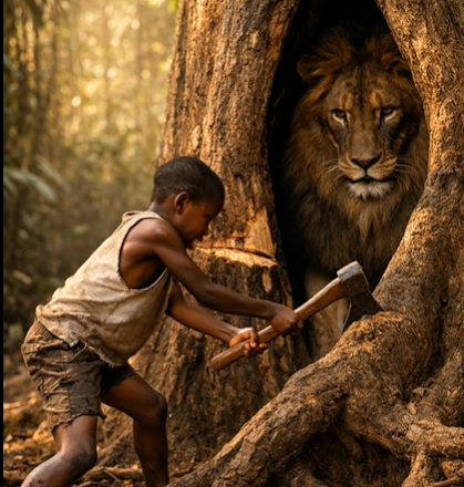 Un pequeño niño salvó a un león que había quedado atrapado dentro del tronco de un árbol… pero lo que hizo el animal después de liberarse nadie pudo explicarlo 😨😱