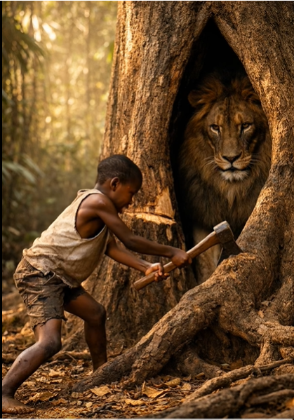 Pero el niño continuó. Otro golpe. Y otro. Le dolían las manos, los dedos le resbalaban en el mango, la respiración se aceleraba. No golpeaba al león, sino al árbol — intentaba ensanchar la abertura.