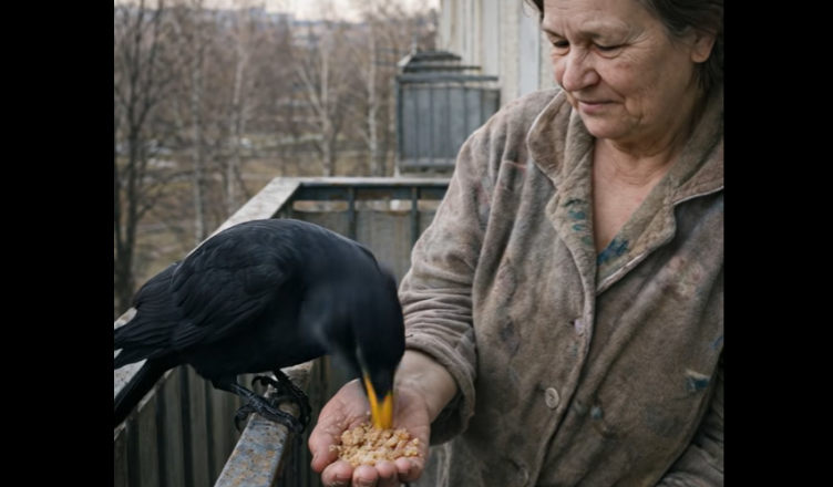 Žena žila sama. Manžel zemřel už dávno, syn se odstěhoval do jiného města a volal čím dál méně. Ráno začínalo konvicí na čaj, starým županem a kroky na balkon. A vrána už čekala — na zábradlí, s lehce nakloněnou hlavou, jako by zdravila.